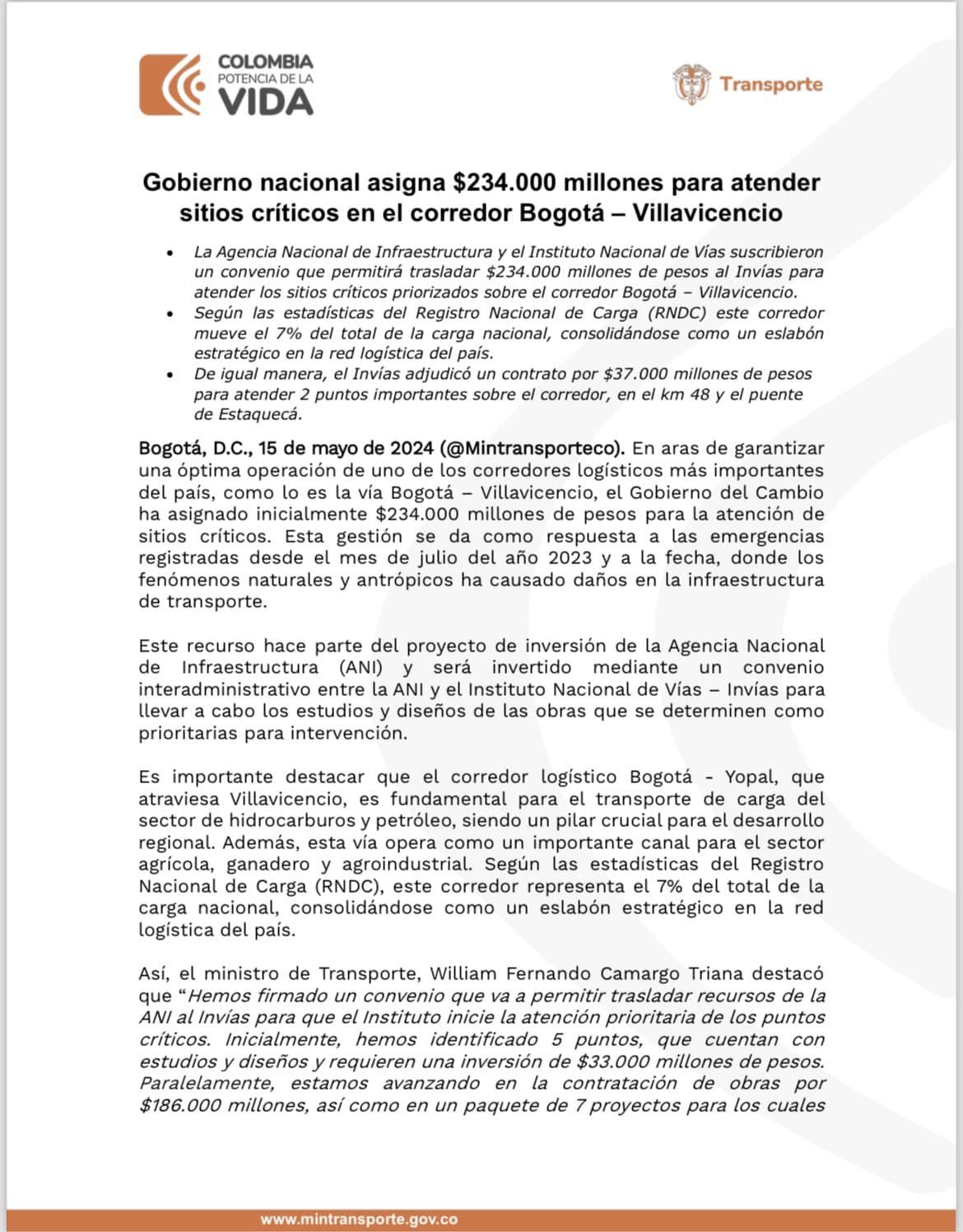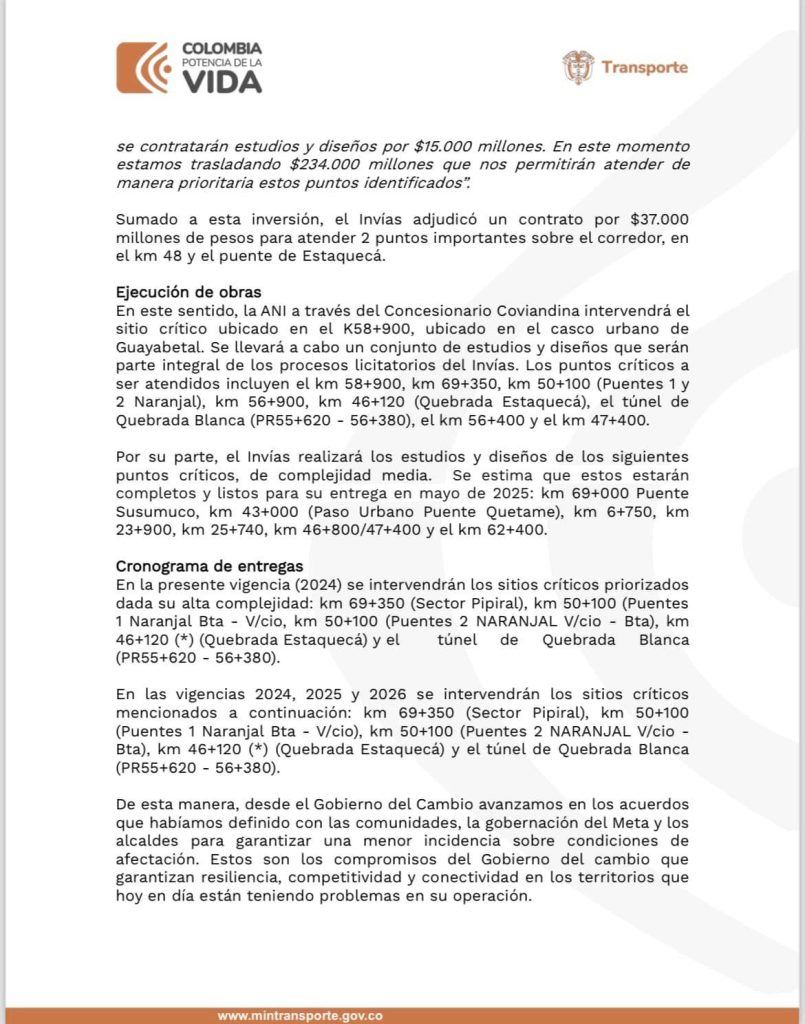Este importante recurso hace parte del proyecto de inversión de la Agencia Nacional de Infraestructura y será invertido mediante un convenio entre la ANI y el Instituto Nacional de Vías para llevar a cabo los estudios y diseños de las obras que se determinen como prioritarias para intervención.
