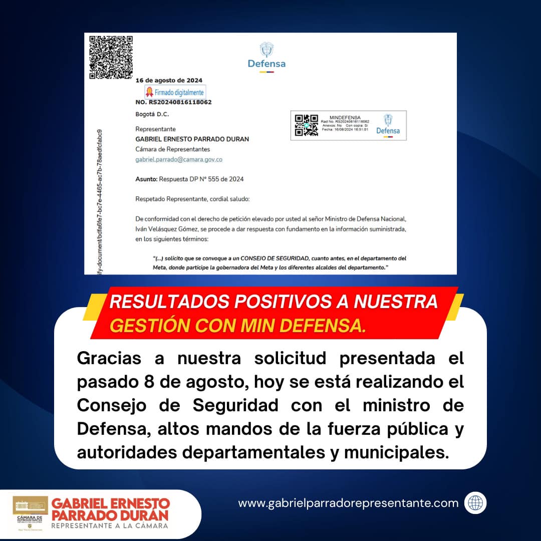 Gracias a esta y otras comunicaciones, hoy TENEMOS RESPUESTA POSITIVA a nuestra petición, y por eso hoy 17 de agosto se está desarrollando en el municipio de Granada el CONSEJO DE SEGURIDAD SOLICITADO, al cual asiste el ministro de defensa, Iván Velásquez, las autoridades civiles, militares del departamento del Meta, de los diferentes municipios afectados además de líderes de diferentes sectores.
